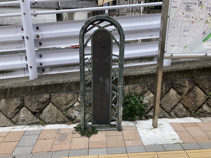 次の坂はポプラ坂下の先で突き当たる赤紙仁王通りの先から北上しているのですが、間違えて谷田川通りに出てしまいました。「東京の河川を歩く」でも通った道です。とある建物の前に案内板が立っています。