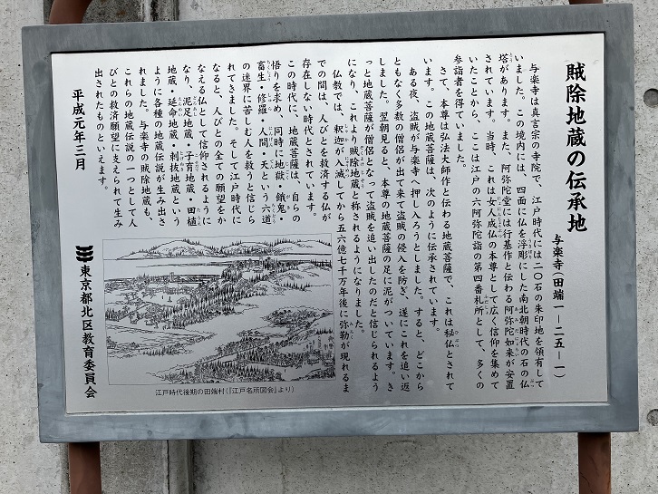 与楽寺は真言宗の寺院で、江戸時代には二十石の朱印地を領有していました。この境内には、四面に仏を浮彫にした南北朝時代の石の仏塔があります。また、阿弥陀堂には行基作と伝わる阿弥陀如来が安置されています。当時、これは女人成仏の本尊として広く信仰を集めていたことから、ここは江戸の六阿弥陀詣の第四番札所として、多くの参詣者を得ていました。さて、本尊は弘法大師作と伝わる地蔵菩薩で、これは秘仏とされています。この地蔵菩薩は、次のように伝承されています。ある夜、盗賊が与楽寺へ押し入ろうとしました。すると、どこからともなく多数の僧侶が出て来て盗賊の侵入を防ぎ、遂にこれを追い返しました。翌朝見ると、本尊の地蔵菩薩の足に泥がついています。きっと地蔵菩薩が僧侶となって盗賊を追い出したのだと信じられるようになり、これより賊除地蔵と称されるようになりました。仏教では、釈迦が入滅してから五十六億七千万年後に弥勒が現れるまでの間は、人びとを救済する仏が存在しない時代とされています。この時代に、地蔵菩薩は、自らの悟りを求め、同時に地獄・餓鬼・畜生・修羅・人間・天という六道の迷界に苦しむ人を救うと信じられてきました。そして江戸時代になると、人びとの全ての願望をかなえる仏として信仰されるようになり、泥足地蔵・子育地蔵・田植地蔵・延命地蔵・刺抜地蔵というように各種の地蔵伝説が生み出されました。与楽寺の賊除地蔵も、これらの地蔵伝説の一つとして人びとの救済願望に支えられて生み出されたものといえます。