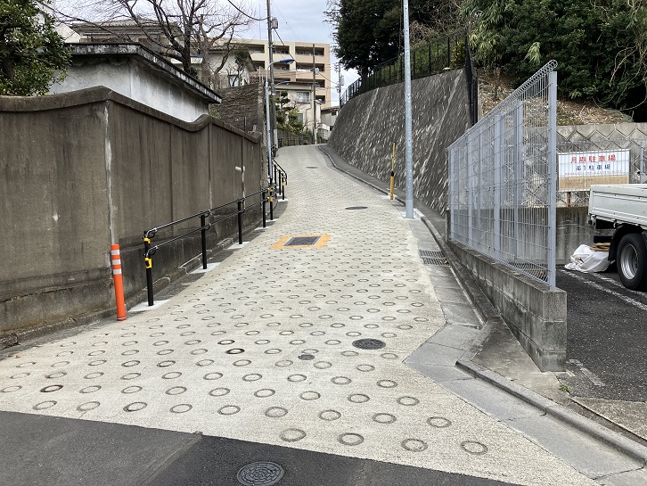 東覚寺坂の坂上から歩道橋を渡って高台の路地に入ります。住宅地内の複雑で狭い道を入った右手に坂が下っています。その先に緩やかな階段が左にカーブしながら続いています。