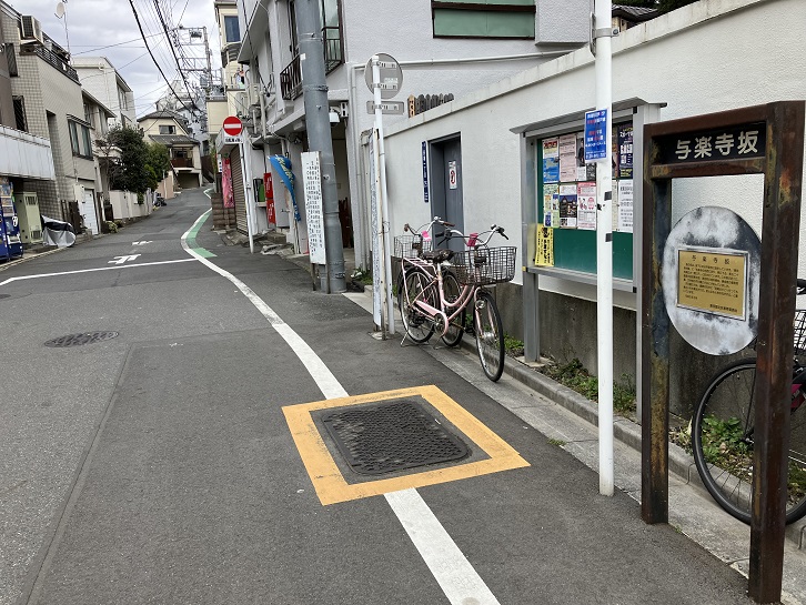 与楽寺坂は長さが約130mほどの左右に曲がりながら上る緩やかな坂です。坂名は、坂下にある与楽寺に由来しています。坂下付近に案内板が立っています。