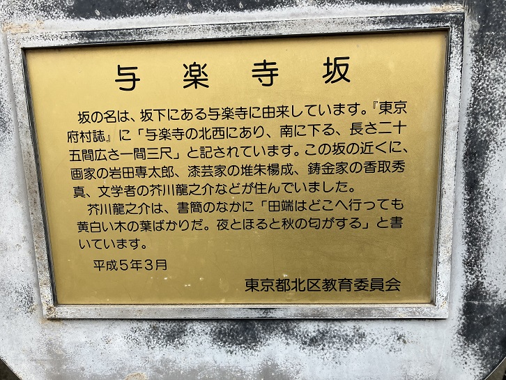 坂の名は、坂下にある与楽寺に由来しています。「東京府村誌」に「与楽寺の北西にあり、南に下る、長さ二十五間広さ一間三尺」と記されています。この坂の近くに、画家の岩田専太郎、漆芸家の堆朱楊成、鋳金家の香取秀真、文学者の芥川龍之介などが住んでいました。芥川龍之介は、書簡のなかに「田端はどこへ行っても黄白い木の葉ばかりだ。夜とほ(通)ると秋の匂がする」と書いています。