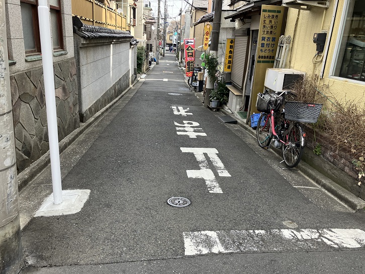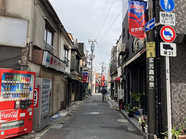 西ヶ原四丁目電停から明治通りに出て滝野川三丁目交差点から国道17号中山道に入ります。滝野川五丁目交差点で右折した先の路地に宮本商店街が続いています。ちなみに、中山道を挟んだ反対側には御代の台仲通り商店街が延びています。