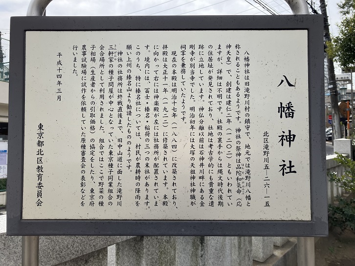 八幡神社は旧滝野川村の鎮守で、地元では滝野川八幡と称されることもあるようです。神社の祭神は品陀和気命(応神天皇)で、創建は建仁二年(1202年)ともいわれていますが、詳細は不明です。社殿の裏手からは縄文時代後期の住居址が発見されており、社地は考古学的にも貴重な遺跡に立地しています。神仏分離以前は石神井川畔にある金剛寺が別当寺でした。明治初年には大塚の天祖神社神職が祠掌を兼務していたようです。現在の本殿は明治十七年(1884年)に改築されており、拝殿は大正十一年(1922年)に修築されています。本殿に向かって右には神楽殿が左には社務所が配置されています。境内には、冨士・榛名・稲荷の三つの末社があります。このうち、特に榛名社については、村民が農耕時の降雨を願い上州の榛名山より勧請したもののようです。神社の社務所は終戦直後まで、旧中山道に面した滝野川三軒家の種子問屋が中心となっていた東京種子同業組合の会合場所として利用されました。組合ではここで野菜の種子相場(生産者からの引取価格)の協定をしたり、東京府農事試験場に試作を依頼していた原種審査会の表彰などを行いました。