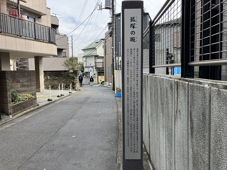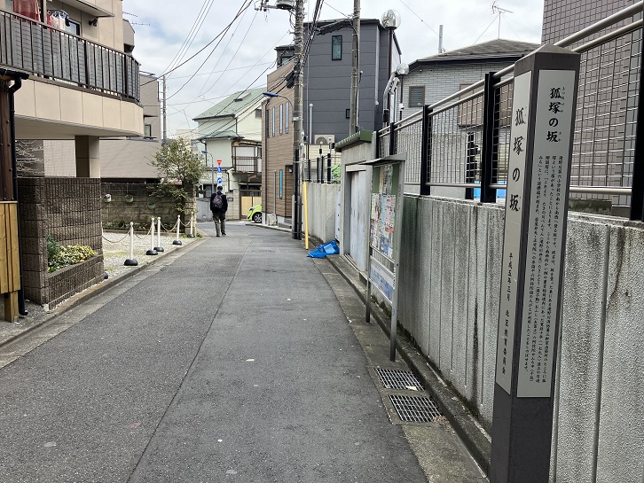 滝野川第六小学校の南から南西へ登る坂です。坂名は、坂を登った東にある滝野川消防署三軒家出張所のところに狐塚という塚があったことによります。ここから南西向かい側の重吉稲荷境内にあった寛政十年(1798年)造立の石造廻国塔に、「これより たきの川べんてん(滝野川弁天)たきふとう(滝不動)おふし(お冨士)六阿弥陀せんちゅ(千住)みち」という道標銘が刻まれ、岩屋弁天・正受院への参詣や六阿弥陀詣の人びとが利用したことをしのばせます。
