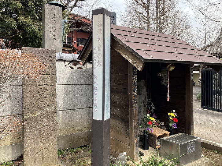 谷津観音の坂は長さが約50mほどの緩やかな坂です。坂名の由来は、坂上の寿徳寺に谷津観音の名で知られる子育観音像が祀られていることに因みます。寿徳寺の門前の小さな祠の隣に案内柱が立っています。
