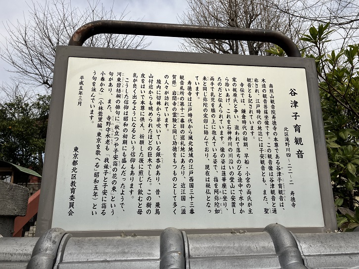 南照山観音院寿徳寺の本尊である谷津子育観音は、木造の観音菩薩坐像です。この観音像は谷津観音と通称され、江戸時代の地誌には子安観音とも、また、聖観音とも記されています。寺伝では、鎌倉時代の初期、早船・小宮の両氏が主家の梶原氏と争い、追われて落ちのびる途中で水中から拾いあげ、これを石神井川の川沿いの堂山に安置したのだと伝えられています。像の姿は蓮華座に坐り、両手で乳児を膝の上に抱えている姿で、指を阿弥陀如来と同じ弥陀の定印に結んでおり、現在は秘仏となっています。寿徳寺は江戸時代から城北地域の江戸西国三十三番観音札所の第十二番目の巡礼地にあたり、近江国(滋賀県)岩間寺の霊験と同じ功徳をもつものとして多くの人々が訪れています。境内に切株から芽吹いている銀杏があり、昔、飛鳥山付近からも眺められたほどの巨木でした。この樹の皮をはいで本尊に供え、祈願した後に煎じて飲むと母乳が良く出るようになるという信仰もあります。こうした信仰は昭和の初期にも盛んだったようで、河東碧梧桐の俳句に「秋立つや子安詣の花束」という句があり、また、寺野守水老も「我妹子と子安に詣る小春かな」(小林鶯里編「東京を歌へる」昭和五年)という句を詠んでいます。