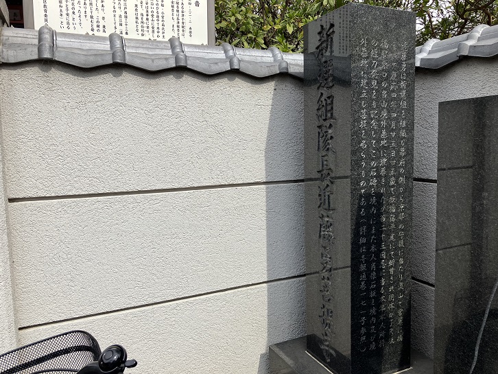 近藤勇は新選組を組織し幕府の側から京都の守護に当たり流山で官軍に捕まって慶応四年四月(二)廿五日(三)廿五歳で板橋宿平尾にて斬首され胴体がJR板橋駅東口の当山境外墓地に埋葬されたが百二十三回忌に当る本年本人所持の短刀発見を記念してこの石碑を境内に、また本人肖像石板を境内及び境外墓地に建立し菩提を弔らうものである(詳細は寺報通巻一七一号参照)