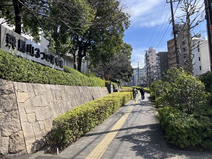 飛鳥大坂は長さが約140mほどの緩やかな坂です。別名は「飛鳥坂」といいます。坂名の由来は、坂の東側が飛鳥山であることに因んでいます。坂上付近の歩道の脇に御影石の案内碑が建っています。