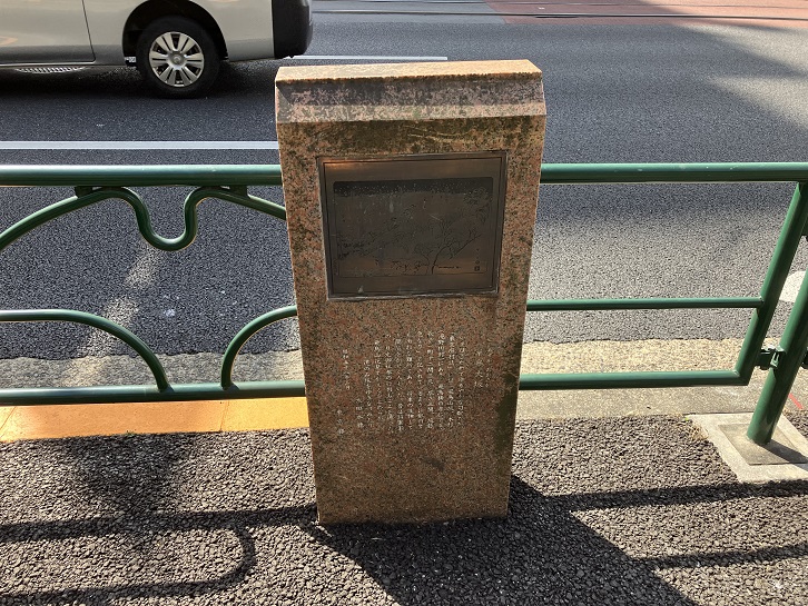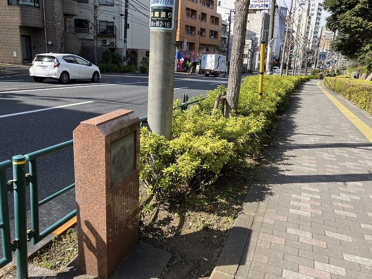 六石坂は長さが約170mほどの緩やかな坂です。坂名の由来は、江戸時代に坂上に租六石を納る水田があったことに因みます。「租」とは日本の律令制において、民衆に一律に支給された農地(班田)に対して課せられた年貢のことです。坂上付近の歩道の植え込みの中に御影石の案内碑が建っています。