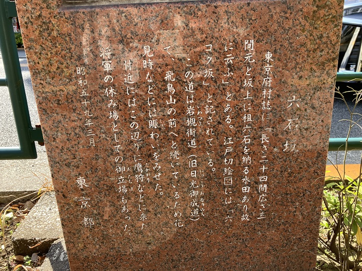 東京府村誌に「長さ二十四間広さ三間元と坂上に租六石を納る水田あり故に云ふ」とある。江戸切絵図には「六コク坂」と記されている。この道は岩槻街道(旧日光御成道)で、飛鳥山の前へと続いているため花見時などには賑わいをみせた。付近にはこの辺りに鷹狩などに来た将軍の休み場としての御立場もあった。