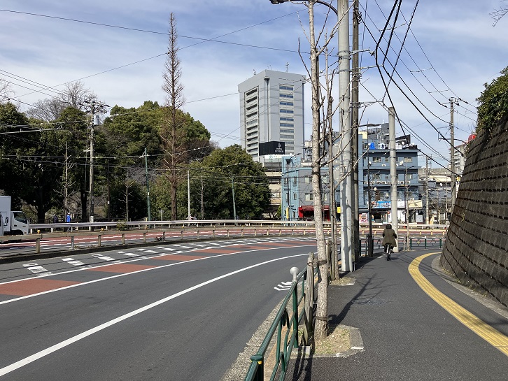 音無橋交差点の手前から右側に弧を描くように明治通りが下っています。