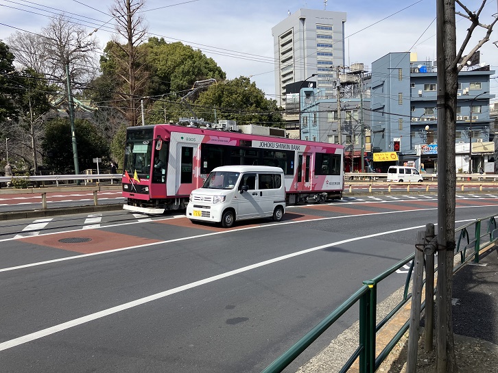 明治通りには都電荒川線が走っています。専用軌道区間が大部分を占める荒川線ですが、王子駅前電停から飛鳥山電停までの明治通りは、唯一車と並走する区間となっています。令和の時代には、昭和を彷彿させる絵になる風景です。