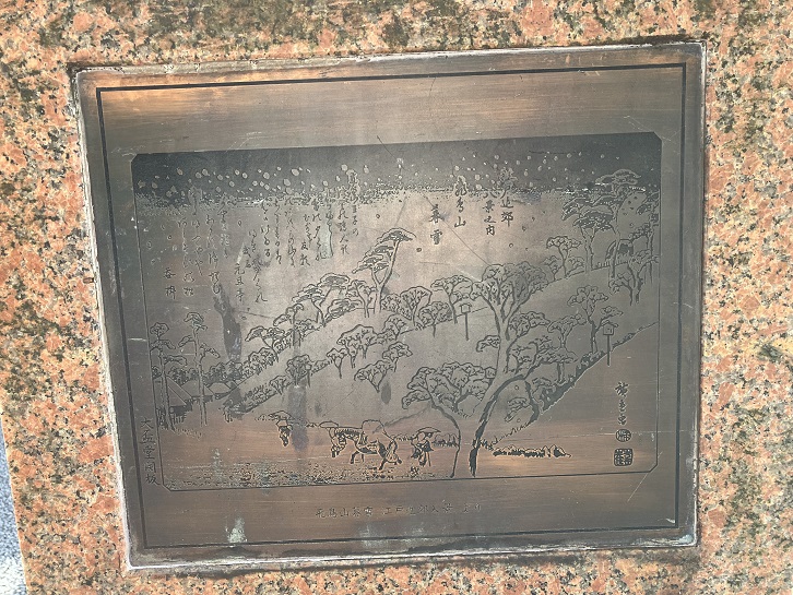 案内碑には、黄昏時に雪の中を歩く人馬の絵が描かれています。