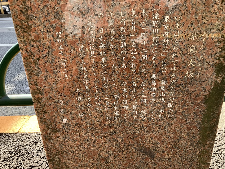 いまはきわめてゆるやかな勾配だが、「東京府村誌」には「飛鳥山坂、本村(滝野川村)にあり、飛鳥橋の方に下る。長さ一町十二間三尺、広さ三間、坂勢急なり」と記されているように都内でも有数な難所であり、荷車の後押して手間賃をかせぐ人もいた。昔は将軍家の、日光御社参の行列もここを通った。