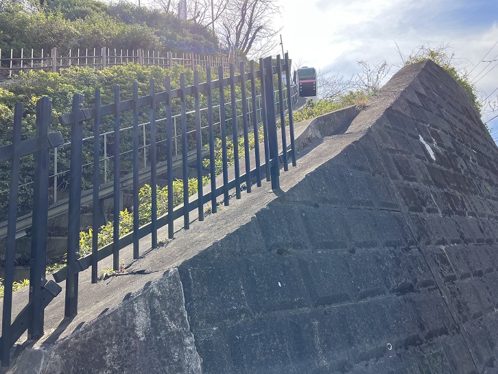 妙見寺坂は長さが約120mほどのかなり急な坂です。坂の途中で左に曲がって線路際まで下りています。坂名の由来は、戦時中に坂上に妙見寺が移転してきたことに因みます。