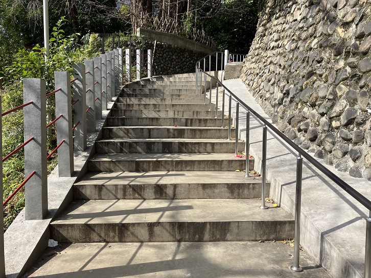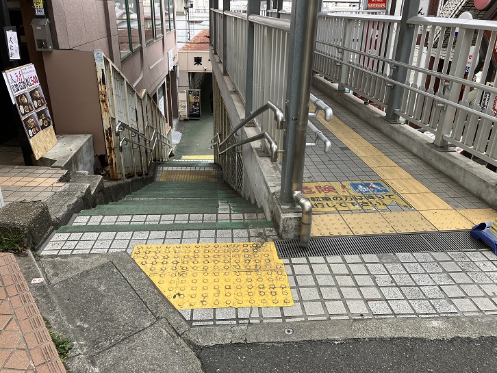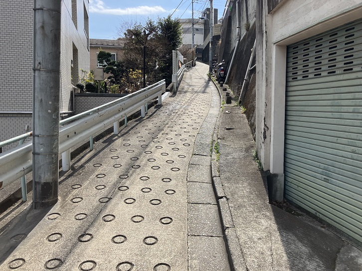 線路と並行して、突き当たりから左手に急坂が下っています。