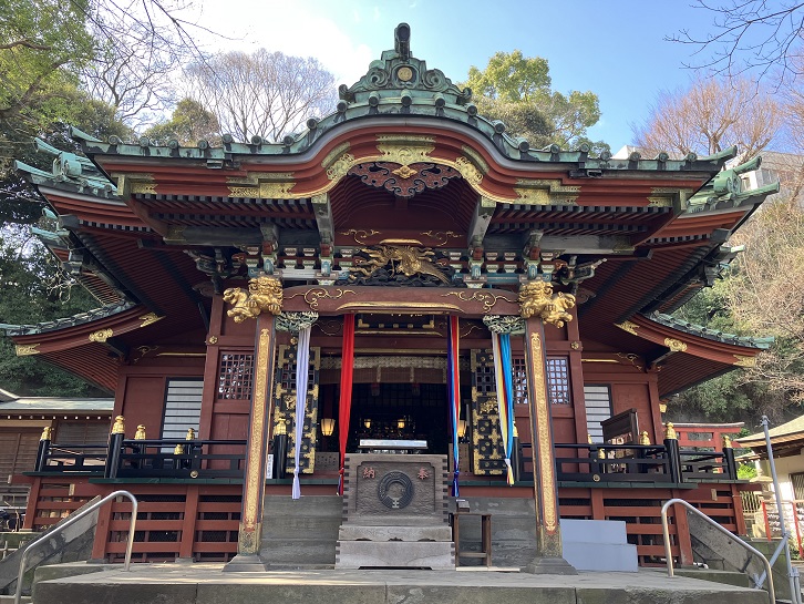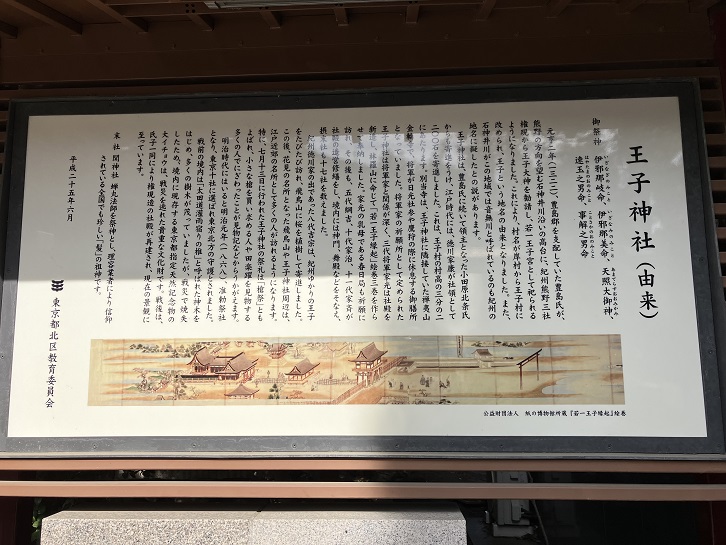 元亨二年(1322年)、豊島郡を支配していた豊島氏が、熊野の方向を望む石神井川沿いの高台に、紀州熊野三社権現から王子大神を勧請し、若一王子宮として祀られるようになりました。これにより、村名が岸村から王子村に改められ、王子という地名の由来となりました。また、石神井川がこの地域では音無川と呼ばれているのも紀州の地名に擬したとの説があります。王子神社は、豊島氏に続いて領主となった小田原北条氏からも寄進をうけ、江戸時代には、徳川家康が社領として二百石を寄進しました。これは、王子村の村高の三分の二にあたります。別当寺は、王子神社に隣接していた禅夷山金輪寺で、将軍が日光社参や鷹狩の際に休息する御膳所となっていました。将軍家の祈願所として定められた王子神社は将軍家と関係が深く、三代将軍家光は社殿を新造し、林羅山に命じて「若一王子縁起」絵巻三巻を作らせて奉納しました。家光の乳母である春日局も祈願に訪れ、その後も、五代綱吉、十代家治、十一代家斉が社殿の造営修繕をし、境内には神門、舞殿などをそなえ、摂末社も十七社を数えました。紀州徳川家の出であった八代吉宗は、紀州ゆかりの王子をたびたび訪れ、飛鳥山に桜を植樹して寄進しました。この後、花見の名所となった飛鳥山や王子神社周辺は、江戸近郊の名所として多くの人が訪れるようになります。特に、七月十三日に行われた王子神社の祭礼は「槍祭」ともよばれ、小さな槍を買い求める人や田楽躍を見物する多くの人でにぎわったことが見物記などからうかがえます。明治時代にはいると明治元年(1868年)、准勅祭社となり、東京十社に選ばれ東京北方の守護とされました。戦前の境内は「太田道灌雨宿りの椎」と呼ばれた神木をはじめ、多くの樹木が茂っていましたが、戦災で焼失したため、境内に現存する東京都指定天然記念物の大イチョウは、戦災を逃れた貴重な文化財です。戦後は、氏子一同により権現造の社殿が再建され、現在の景観に至っています。