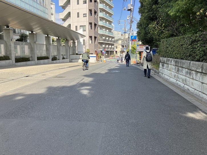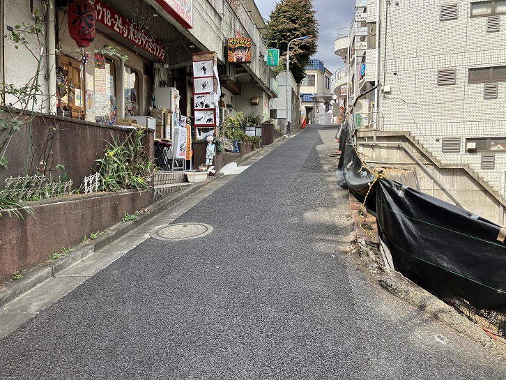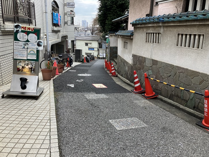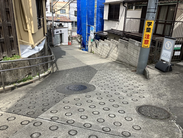 芝坂の坂上から路地を縫って北方向に進みます。東十条駅の手前付近から坂が曲がりくねって下っています。