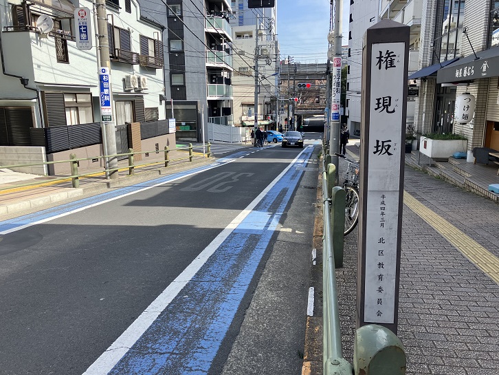 権現坂とは、坂の下の交差点から王子神社の鳥居付近まで登っていく坂道をいいます。権現という坂の名称は、王子神社が、明治初年の神仏分離令以前は王子権現と呼ばれていたことに由来しています。坂の下の交差点付近は、江戸幕府の将軍が日光東照宮に参拝するための日光御成道と接しており、三本杉橋という橋が架かっていました。三本杉橋は橋の近くに三本の杉があったのでつけられた名称といわれています。