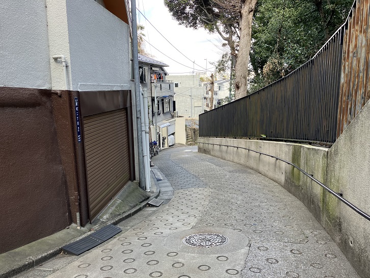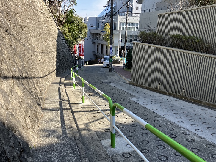 芝坂は長さが約100mほどで、自動車が通れないほどの幅の狭い急な坂です。坂の前半区間は下り坂ですが、(坂からは看板が見えなくて分かり辛いですが)宇田川整形外科の脇を底にして、後半区間は階段となって上っています。坂名の由来は不明です。昔は芝の生い茂る崖道だったのでしょう。
