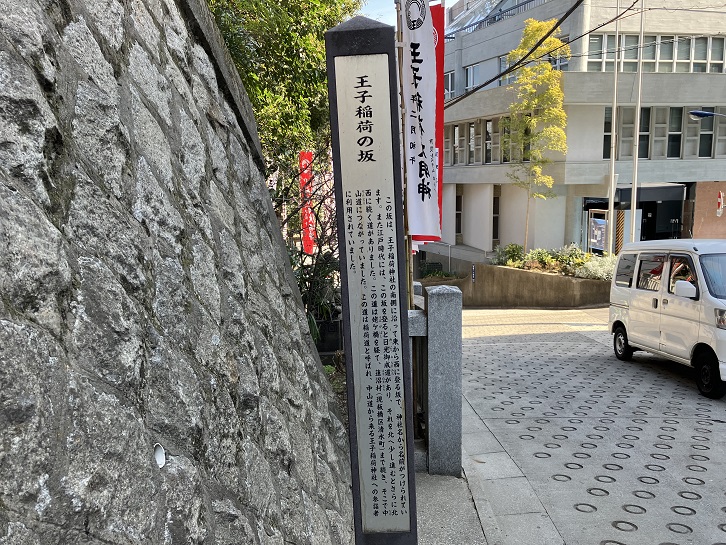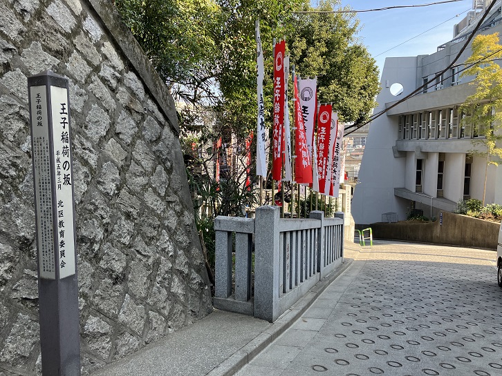 王子稲荷の坂は長さが約120mほどの急な坂です。坂名は、王子稲荷神社の前を通る坂ということに因みます。坂の中ほどに案内柱が立っています。