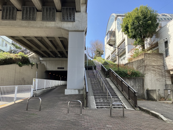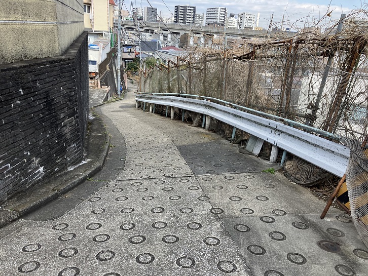 東十条駅の北口改札から繋がる跨線橋の手前に、大きく彎曲して跨線橋に繋がる坂が上っています。