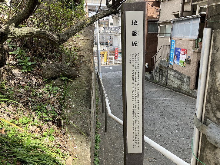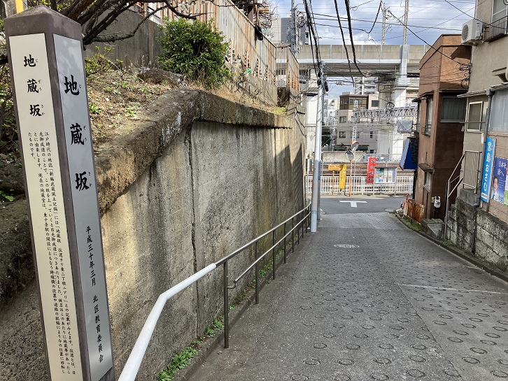 地蔵坂は長さが約60mほどのやや急な坂で、左右に曲がりながら東十条駅の南口の跨線橋下に繋がっています。坂名は、かって坂の途中に地蔵堂があったことに因んで名付けられました(現在、地藏堂は近くに移動されています)。坂の曲がり角付近に案内柱が立っています。