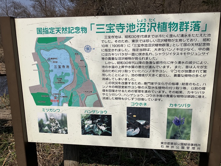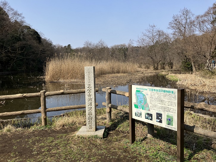 三宝寺池には手つかずの自然が残っていて、「三宝寺池沼沢植物群落」として保存活動が行なわれています。三宝寺池は、井の頭池・善福寺池と並んで武蔵野三大湧水池としても知られています。