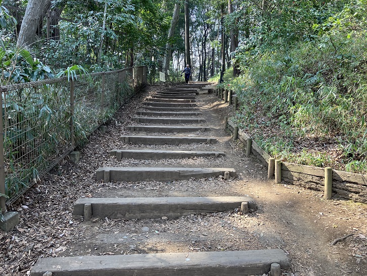 石神井城址碑の後方は丘陵になっていて、階段で登ると左手に本郭跡と空堀や土塁の遺跡が保存されています。