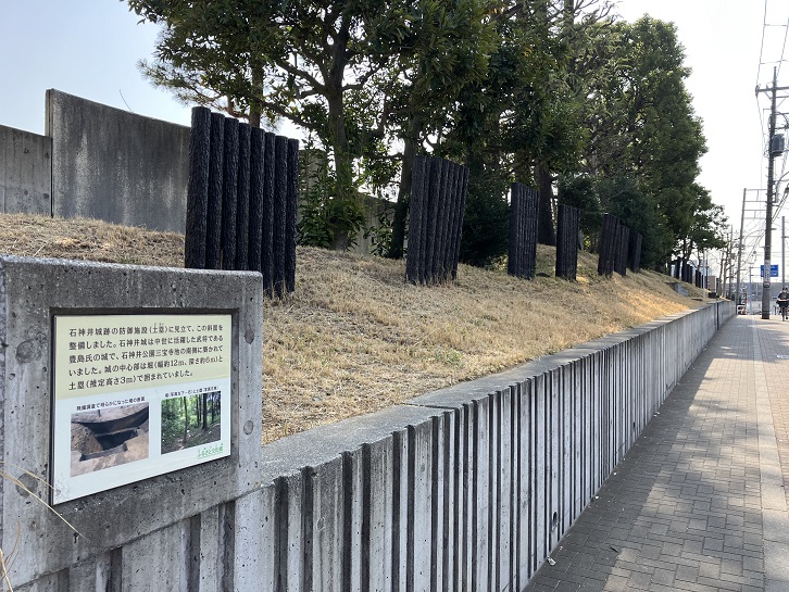 三宝寺池バス停付近から石神井公園ふるさと文化館まで井草通りが上り坂になっています。石神井公園ふるさと文化館の側塀の上には、石神井城の土塁を模した防御杭が並んでいます。