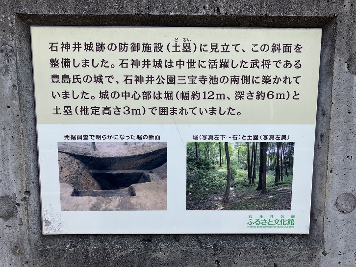 石神井城跡の防御施設(土塁)に見立て、この斜面を整備しました。石神井城は中世に活躍した武将である豊島氏の城で、石神井公園三宝寺池の南側に築かれていました。城の中心部は堀(幅約12m、深さ約6m)と土塁(推定高さ3m)で囲まれていました。