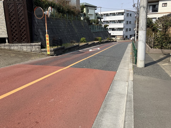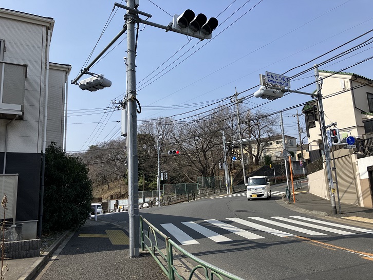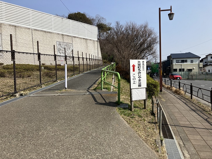 大泉JCTでは関越自動車道が高架で北西に向かい、東京外環自動車道は半地下で北に向かっています。東京外環自動車道に沿って北に進み、大泉一小の角で東側に折れた先のもみじ山公園の東端から坂が上っています。