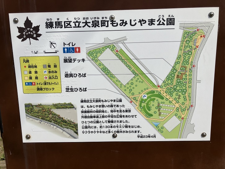 練馬区立大泉町もみじやま公園は、もみじやま憩いの森であった。保護樹林の傾斜地と、地中を走る東京外環自動車道上部の平坦な広場をあわせて、ひとつの公園として整備されました。公園内には、約130本のモミジ類をはじめ、サクラやケヤキなど多くの樹木がみられます。