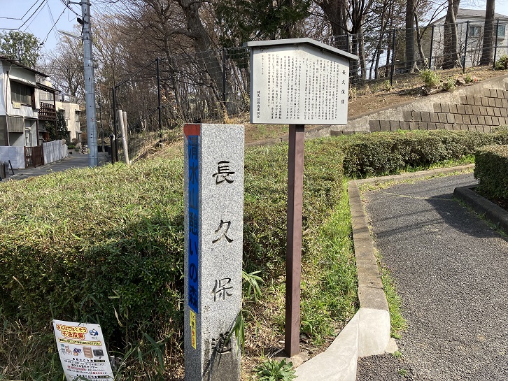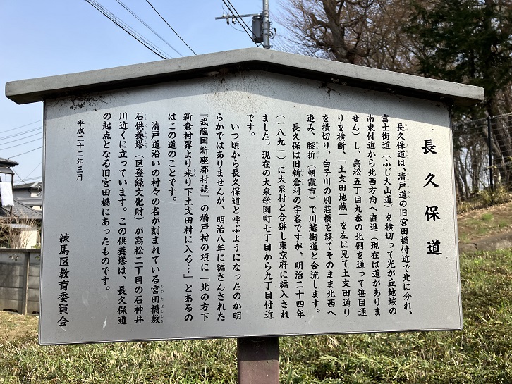 長久保道は、清戸道の旧宮田橋付近で北に分れ、富士街道(ふじ大山道)を横切って光が丘地域の南東付近から北西方向へ直進(現在は道がありません)し、高松五丁目九番の北側を通って笹目通りを横断、「土支田地蔵」を左に見て土支田通りを横切り、白子川の別荘橋を経てそのまま北西へ進み、膝折(朝霞市)で川越街道と合流します。長久保は旧新倉村の字名ですが、明治二十四年(1891年)に大泉村と合併し東京府に編入されました。現在の大泉学園町七丁目から九丁目付近です。いつ頃から長久保道と呼ぶようになったのか明らかではありませんが、明治八年に編さんされた「武蔵国新座郡村誌」の橋戸村の項に「北の方下新倉村界より来り下土支田村に入る・・・」とあるのはこの道のことです。清戸道沿いの村々の名が刻まれている宮田橋敷石供養塔(区登録文化財)が高松二丁目の石神井川近くに立っています。この供養塔は、長久保道の起点となる旧宮田橋にあったものです。