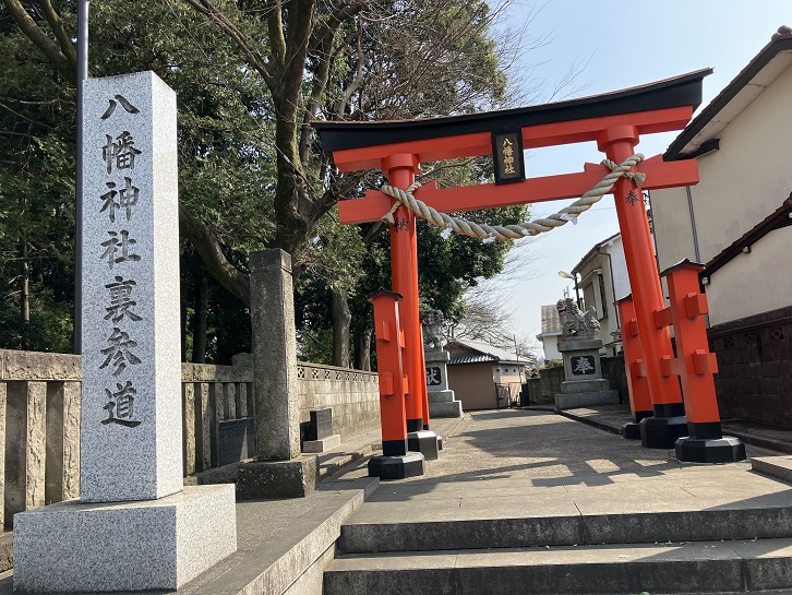 光が丘五小前交差点から小道に入り、高松駐在所前交差点を経て、環八沿いの八幡神社裏手に着きます。不謹慎にも神社の境内を通り抜けます。一の鳥居の先に石神井川が流れています。