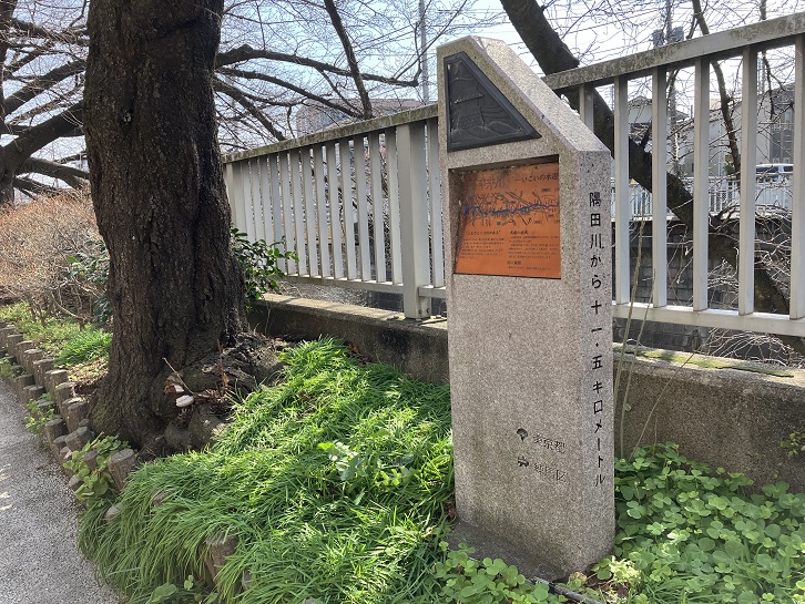 石神井川沿いの遊歩道を進んで氷川台に向かいます。石神井川は、小平市花小金井南町にある小金井カントリー倶楽部敷地内の湧水を水源として、小平市・西東京市・練馬区・板橋区・北区を流れ、北区堀船三丁目で隅田川に合流しています。石神井川には地域によっていろいろな呼称があり、小平市・西東京市では「悪水」、西東京市・練馬区の一部では「大川」、練馬区・板橋区では「石神井川」、北区では「音無川」・「王子川」・「滝野川」と呼ばれていました。「滝野川」という河川名は北区滝野川の地名に残っていて、昔はこの地域の石神井川が「川の流れが滝のように勢いよく激しかった」ことに由来しています。遊歩道の脇に標識の石柱が建っています。