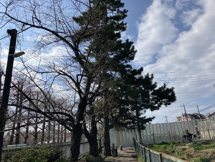 遊歩道脇に立派な松の木が聳えています。