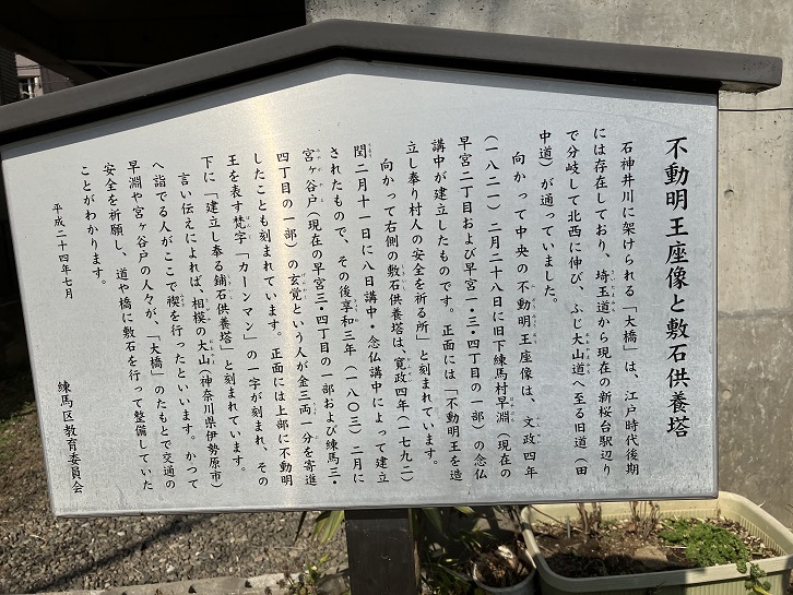 石神井川に架けられる「大橋」は、江戸時代後期には存在しており、埼玉道から現在の新桜台駅辺りで分岐して北西に伸び、ふじ大山道へ至る旧道(田中道)が通っていました。向かって中央の不動明王座像は、文政四年(1821年)二月二十八日に旧下練馬村早淵(現在の早宮二丁目および早宮一・三・四丁目の一部)の念仏講中が建立したものです。正面には「不動明王を造立し奉り村人の安全を祈る所」と刻まれています。向かって右側の敷石供養塔は、寛政四年(1792年)閏二月十一日に八日講中・念仏講中によって建立されたもので、その後享和三年(1803年)二月に宮ヶ谷戸(現在の早宮三・四丁目の一部および練馬三・四丁目の一部)の玄覚という人が金三両一分を寄進したことも刻まれています。正面には上部に不動明王を表す梵字「カーンマン」の一字が刻まれ、その下に「建立し奉る鋪石供養塔」と刻まれています。言い伝えによれば、相模の大山(神奈川県伊勢原市)へ詣でる人がここで禊を行ったといいます。かつて早淵や宮ヶ谷戸の人々が、「大橋」のたもとで交通の安全を祈願し、道や橋に敷石を(持って?)行って整備していたことがわかります。