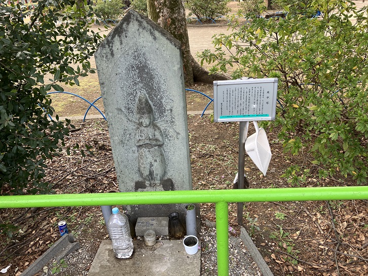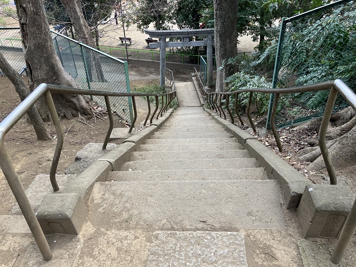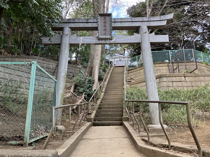 遊歩道の右手に公園があり、その奥の小高い崖の上に神社が鎮座しています。正面の表参道石段はなかなか立派です。練馬区の坂に入れてもいいですね。「高稲荷神社」は、高台に稲荷があるので「高稲荷」と言われるようになったとされています。また、若者が大蛇に見込まれて沼に引き込まれたという「高稲荷と大蛇」の伝説も伝わっています。