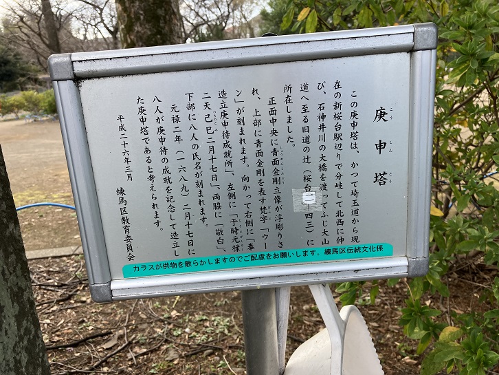 この庚申塔は、かつて埼玉道から現在の新桜台駅辺りで分岐して北西に伸び、石神井川の大橋を渡ってふじ大山道へ至る旧道の辻(桜台二丁目43番地)に所在しました。正面中央に青面金剛立像が浮彫りされ、上部に青面金剛を表す梵字「ウーン」が刻まれます。向かって右側に「奉造立庚申待成就所」、左側に「于時元禄二天己(つちのと)巳二月十七日」、両脇に「敬白」、下部に八人の氏名が刻まれます。元禄二年(1689年)二月十七日に八人が庚申待の成就を記念して造立した庚申塔であると考えられます。