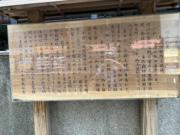 ここは、明治三年四月十七日、明治天皇駒場野の練兵天覧御幸の際、御往復共、当御嶽神社拝殿を御座所に当てられ、御小休所となった所であります。当日は、午前五時御乗馬にて、皇居を御出発され、外桜田より赤坂をお通りになり、吉井友謹邸にて御小休、更に御板興に御移乗になり、当御嶽神社に於て御小休御召換になり、御乗馬にて駒場連兵場に向かわれました。午前八時駒場野御着、午前九時烽大(花火)一発を合図に、練兵を御覧になり午後三時に終了致しました。午後四時、号砲一声還御となり、前軍より次第に列を進められ、御嶽神社、吉井邸にて各々御小休され、午後六時還幸になりました。翌十八日、明治天皇の恩召により当神社に鳥居及び駒寄せの御奉納がありました。昭和十四年二月、明治天皇聖蹟記念碑を建立しました。