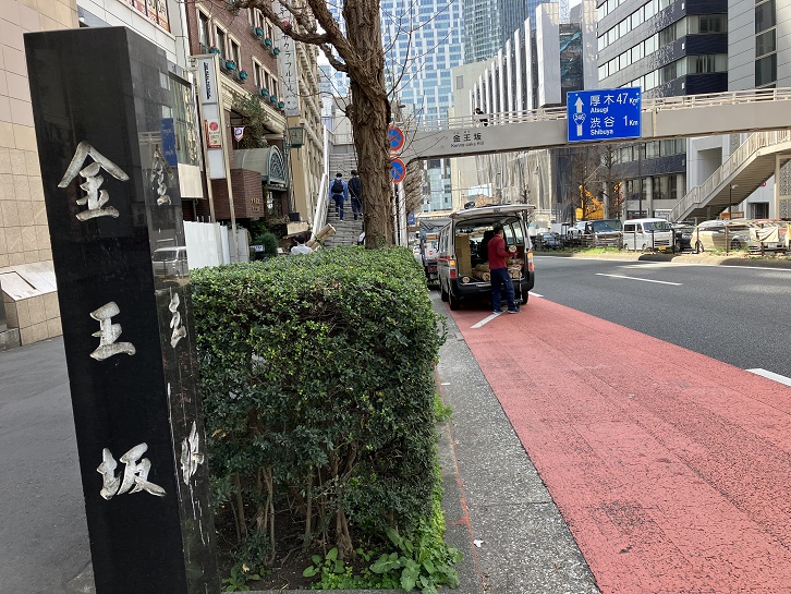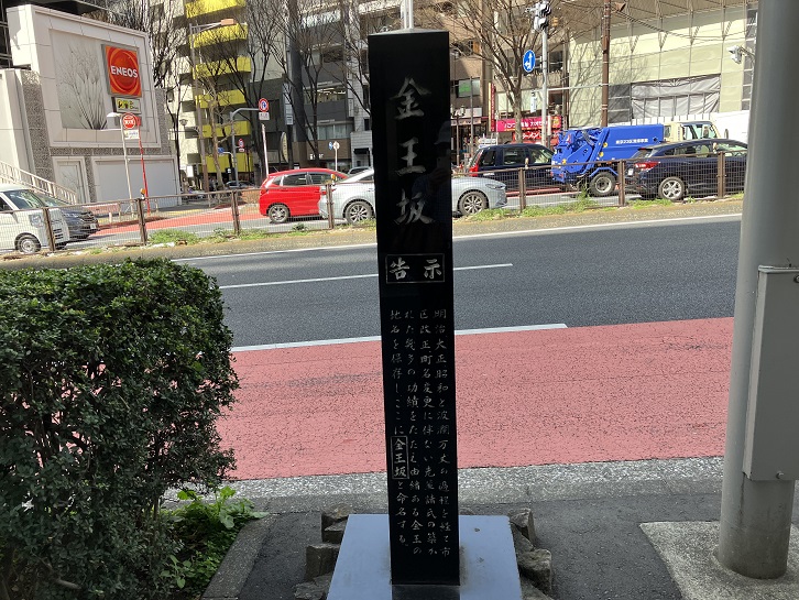 金王坂(こんのうざか)は長さが約170mほどの緩やかな坂です。昭和五十四年にこの付近の町名変更が行われ、「渋谷区渋谷」となりました。「金王町」という旧町名が消滅するのを惜しんだ地元の町会有志が「金王」の地名を残すために坂名としました。坂上付近に町会が建てた私設の黒い御影石の案内柱が立っています。