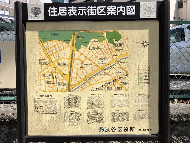 大鳥居をくぐって参道を進みます。金王八幡宮の向かいに渋谷区の住居表示街区案内板が立っています。