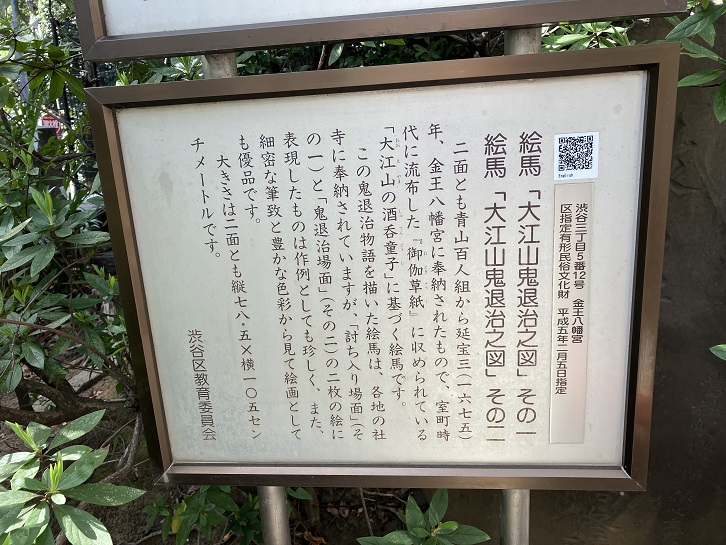 ニ面とも青山百人組から延宝三年(1675年)、金王八幡宮に奉納されたもので、室町時代に流布した「御伽草紙」に収められている「大江山の酒呑童子」に基づく絵馬です。この鬼退治物語を描いた絵馬は、各地の社寺に奉納されていますが、「討ち入り場面」(その一)と「鬼退治場面」(そのニ)のニ枚の絵に表現したものは作例としても珍しく、また、細密な筆致と豊かな色彩から見て絵画としても優品です。大きさは二面とも縦78.5x横105センチメートルです。