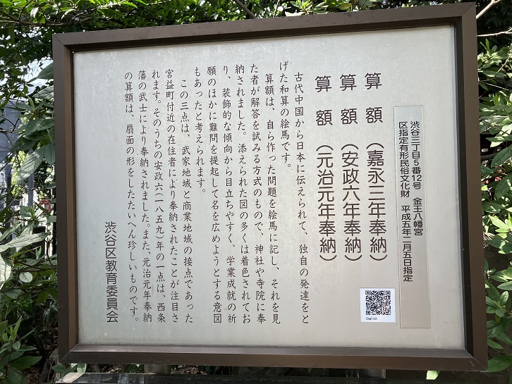 絵馬二点と算額三点は有形民俗文化財に指定されています。金王八幡宮は冲方丁の小説「天地明察」の舞台になっていて、算額が多く奉納されました。