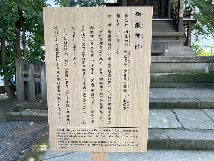 御嶽神社は、開運・商売繁盛の神として、特に客商売を営む人々の信仰を広く集めており、御本社は武州御嶽神社です。御祭神の日本武尊は、古来より武道の守護神として崇められ、この地が、武門の誉れ高き澁谷氏の居城であったことから、ここに把られたと考えられます。また、社前の狛犬一対と西参道の鳥居はかつて実践女子学園の校内にあった香雪神社より大東亜戦争後移設したものです。