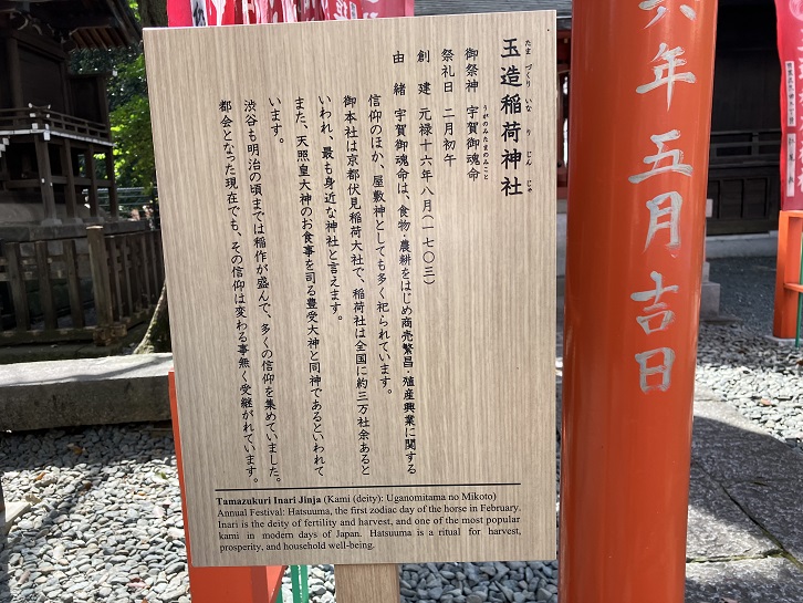 宇賀御魂命は、食物・農耕をはじめ商売繁盛・殖産興業に関する信仰のほか、屋敷神としても多く祀られています。御本社は京都伏見稲荷大社で、稲荷社は全国に約三万社余あるといわれ、最も身近な神社と言えます。また、天照皇大神のお食事を司る豊受大神と同神であるといわれています。渋谷も明治の頃までは稲作が盛んで、多くの信仰を集めていました。都会となった現在でも、その信仰は変わる事無く受継がれています。