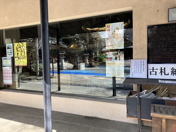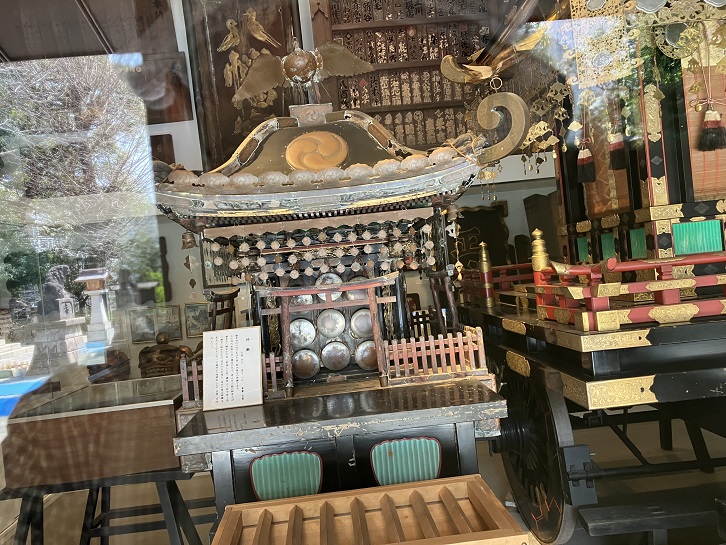 社務所の隣の宝物殿に二基の神輿が保管・展示されています。右側は三年に一度の例大祭で渡御に使われている鳳輦(ほうれん:元々は「屋根に鳳凰の飾りのある天子の車」という意味ですが、現在では「神社の祭りなどに使われる鳳凰の飾りがある神輿」を意味します)、左側は展示のみとなっているようですが本社神輿です。さすが渋谷・青山の総鎮守、鳳輦は立派な神輿ですね。重くて担ぐには難しいのか、牛車に乗せて渡御するみたいです。本社神輿は都内に現存する最古の神輿といわれています。これには伝説が残っています。追手は鎌倉から目黒まで追いかけてきたのですか!鎌倉八幡宮にとって余程大事な神輿だったのでしょう。