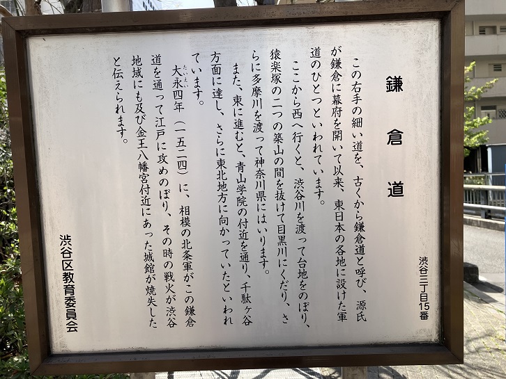 この右手の細い道を、古くから鎌倉道と呼び、源氏が鎌倉に幕府を開いて以来、東日本の各地に設けた軍道のひとつといわれています。ここから西へ行くと、渋谷川を渡って台地をのぼり、猿楽塚のニつの築山の間を抜けて目黒川にくだり、さらに多摩川を渡って神奈川県にはいります。また、東に進むと、青山学院の付近を通り、千駄ヶ谷方面に達し、さらに束北地方に向かっていたといわれています。大永四年(1524年)に、相模の北条軍がこの鎌倉道を通って江戸に攻めのぼり、その時の戦火が渋谷地域にも及び金王八幡宮付近にあった城館が焼失したと伝えられます。