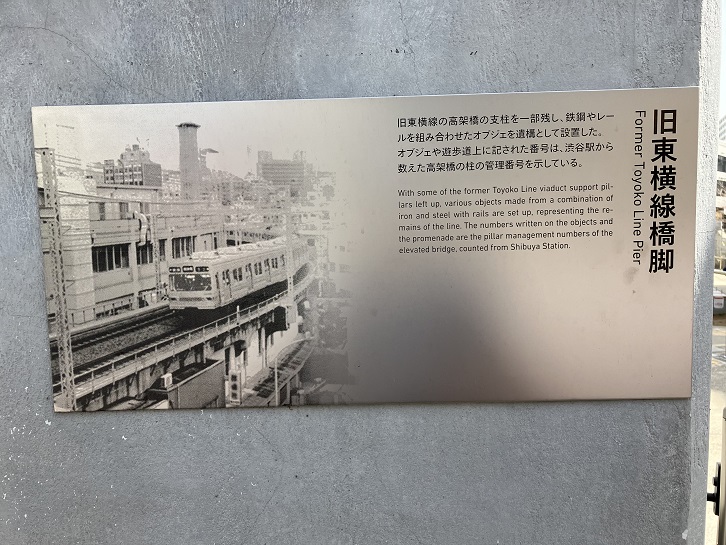 旧東横線の高架橋の支柱を一部残し、鉄鋼やレールを組み合わせたオブジェを遺構として設置した。オブジェや遊歩道上に記された番号は、渋谷駅から数えた高架橋の柱の管理番号を示している。